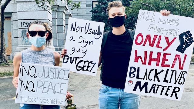 Homemade signs included artwork or words, each with their own message, such as: “With liberty and justice for some??,” “All lives matter only when black lives matter,” “Not about looting a target; not about being one either” and “We’re not trying to start a race war; we’re trying to end one.”