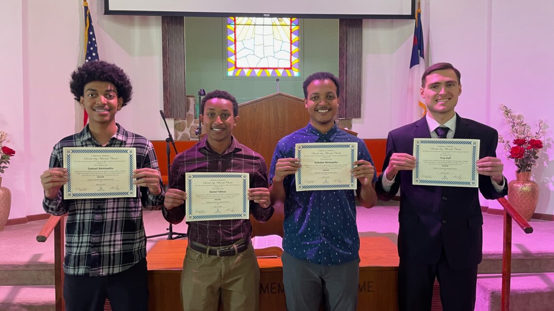 Kalkidan Alemayehu, Samuel Alemayehu, Troy Poff and Daniel Tafesse were ordained as deacons during a worship service last April at the Gladstone Church in Kansas City, Missouri. Pastor Philip Dangal noted that the church did not call them, but only recognized the call of God, and thanked the young men for saying “Yes” to the Holy Spirit and this service in God’s house. He later shared a message from Acts 6 and 7 on the unshakable faith of Stephen, one of the first deacons chosen by the early church and exhorted the ordinands as well as the congregation to be people of faith, wisdom, power, grace and filled with the Holy Spirit. In addition to serving as deacons, all four serve on the church grounds crew. Daniel Tafesse is also a member of the audio/visual team, a children’s Sabbath school substitute teacher, and assistant youth leader. Troy Poff recently returned from a year of teaching at an Adventist school in India.
