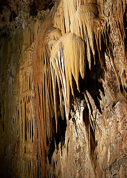 On our tour, we saw two football-field-sized rooms, the Rotunda and Throne Rooms, in the upper caverns. Forty-five years after its original discovery, we could still see Tenen and Tuft’s footprints showing how careful they were to preserve the cave. Colorful mineral formations as small as a soda straw, some in the color and configuration of bacon, curtains, and cottage cheese filled the caverns. The tour concluded in the Throne Room with a light and music display, showcasing an impressive formation called Kubla Khan that reaches 58 feet from floor to ceiling.