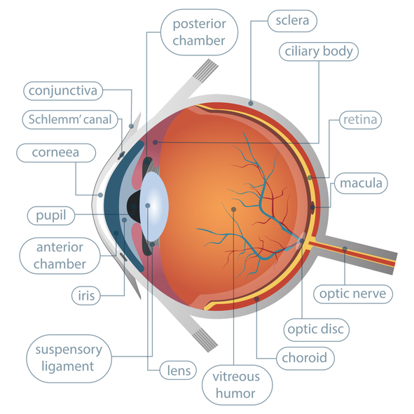 The outermost layer of the eye is the cornea. It gets its food and oxygen from tears, which lubricate the cornea and kill bacteria. This is an example that many parts of the eye work together in order to perform the way they are designed. When the eye first encounters light, it passes through the crystalline lens, which is located behind the pupil, and it has no color. This lens helps to focus the light coming into the retina, which then transforms light signals into electronic messages to the brain. After going through the lens, light then travels through a jelly-like tissue called the vitreous humor before it reaches the retina. Due to the spherical shape of the lens, the projected light images are distorted, but our fast brain corrects these distortions, giving us a perfect image.